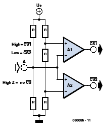 All we need are two op-amps or comparators sharing a single operating voltage of 5 V and outputs capable of reaching full Low and High levels in 5-V operation (preferably types with rail-to-rail outputs). Suitable examples to use are the LM393 or LM311.The resistances in the voltage dividers in this circuit are uniformly 10 kilo ohms. Consequently input A lies at half the operating voltage (2.5 V), assuming nothing is connected to the input – or the microcontroller pin connected is at high impedance. The non-inverting input of IC1A lies at two thirds and the inverting input of IC1B at one third of the operating voltage, so that in both cases the outputs are set at High state. If the microcontroller pin at input A becomes Low, the output of IC1B becomes Low and that of IC1A goes High. If A is High, everything is reversed. |