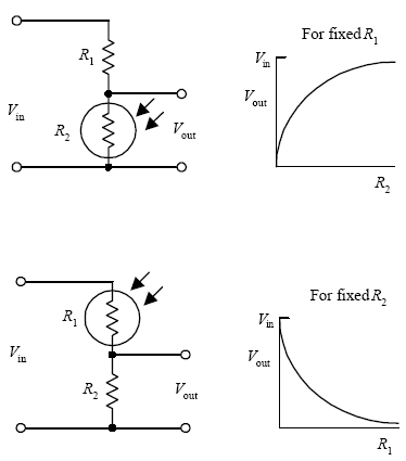 As the intensity of light increases, the resistance of the photoresistor decreases, so Vout in the top circuit gets smaller as more light hits it, whereas Vout in the lower circuit gets larger.